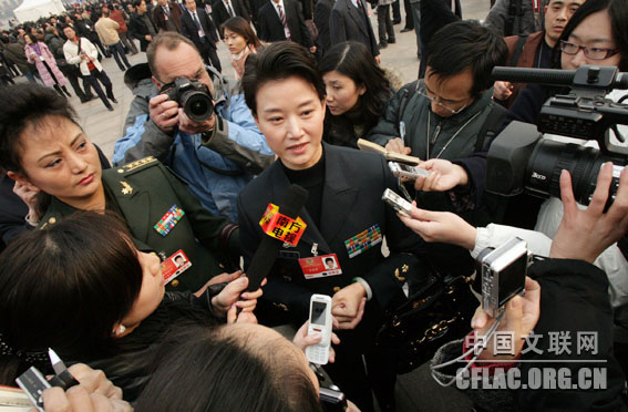 3月3日,中国人民政治协商会议第十一届全国委员会第二次会议在北京人民大会堂开幕。图为政协委员宋祖英接受媒体采访。中国文联网 孟祥宁 摄 |