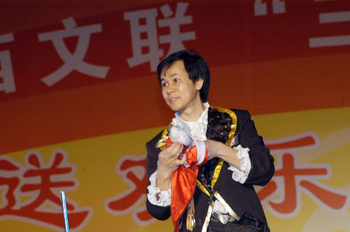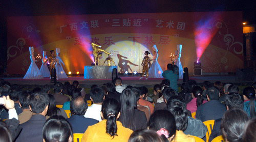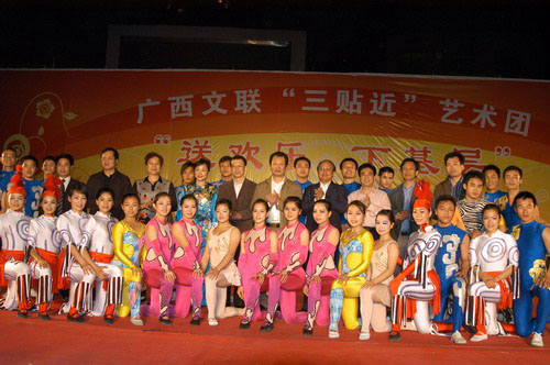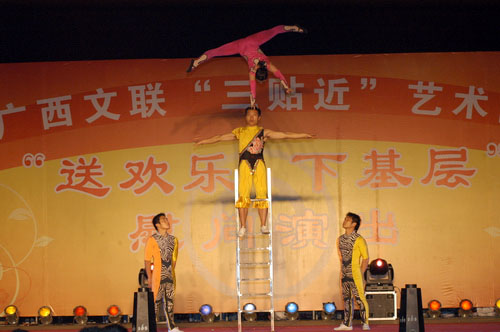 此次慰问演出的主体为玉林市杂技团。该团是一支拥有一流的演出队伍和杂技专业培训的艺术团体,该团所创造的高、难、险、准的表演技巧风格,得到了广西杂技界的认可与推崇,多次代表广西出访日本、美国、德国、加拿大、西班牙等国家,此前这支团队刚刚结束在澳大利亚长达半年的演出,月底又将赴英国进行数月的巡演。当广西杂技家协会领导邀请该团加入广西文联“三贴近”艺术团,下到基层慰问演出时,团员们欣然应允,皆以饱满的热情参加了这次活动。演出中,大家不遗余力地亮出自己的绝活技艺;而演出前后的装台拆台,也是分工有序,个个又都成为装卸工。大家表示,只要老百姓喜欢,再苦再累心里也觉得甜。来自广西杂技团的魔术师李艳说,能加入广西文联“三贴近”艺术团真是感到非常荣耀,感谢广西文联,给了我们文艺家、文艺工作者们一个在基层群众面前展示技艺的平台、一个回报社会的机会,今后更要努力在艺术之路上耕耘跋涉,为广西文艺的发展繁荣全力奉献。