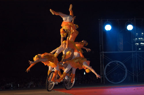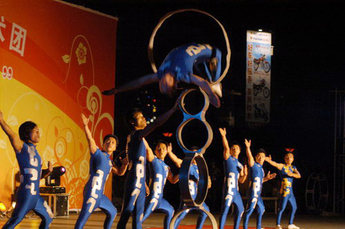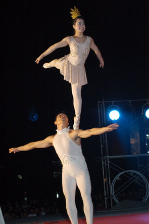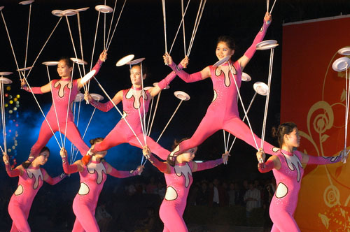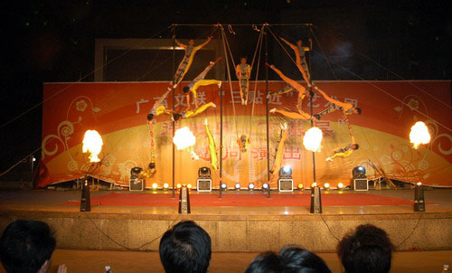演出的当晚,当夜幕降临、华灯初上时,无论是在钦州港经济开发区的中山广场,还是在灵山县六峰山下的人民广场,很多群众早早就来到晚会现场,为的是能占据理想席位以便更好地欣赏演出节目。当身着各式盛装的杂技演员们在欢快奔放的音乐旋律下,又翻又跳,或刚或柔,小试身手地进行开幕式的亮相后,观众们的情绪立时高涨起来。此后,气势恢宏的《爬杆》,美仑美奂的《柔术滚灯》、《肩上芭蕾》,惊险紧张的《高空晃梯》、《台圈》,眼花瞭乱的《转碟》,造型优美的《女子车技》,活泼帅气的《草帽飞舞》等精彩杂技节目轮番上演,让观众目不瑕接,更有魔术舞蹈《变伞》和《现代魔术》引人入胜,而诙谐幽默的《轮胎训练》、《天鹅湖》等节目则让观众笑得合不拢嘴,最令人叹为观止的恐怕要数表现力与美的男子双人表演《力量》,叠背倒立、头顶单手倒立、赤手提顶、屈叠平衡等一系列高难度技巧动作,两位演员做得从容、到位。整个演出过程中,掌声、惊叹声、喝彩声、笑声此起彼伏,万人广场上始终洋溢着热烈欢乐的气氛。很多群众都是头一次现场观看杂技魔术表演,大呼过瘾的观众演出结束后久久不愿离去。