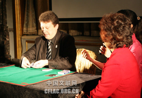 4月17日至19日,世界近台魔术界的五位大师为京城百姓献上了精彩的“不能说的秘密——国际顶级近台魔术秀”。图为魔术师表演近台魔术。中国文联网