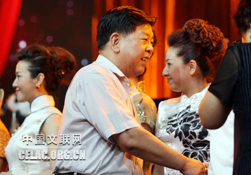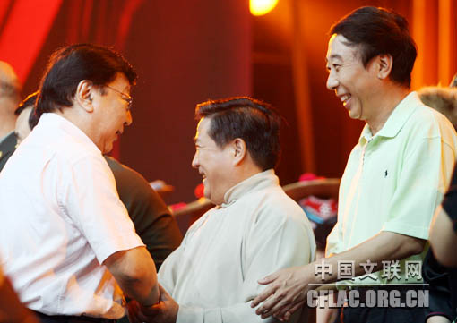 7月8日,“笑声与时代——庆祝中国曲艺家协会成立60周年专场晚会”在北京举行。图为演出结束后,全国政协副主席郑万通和演员握手。中国文联网