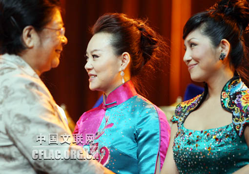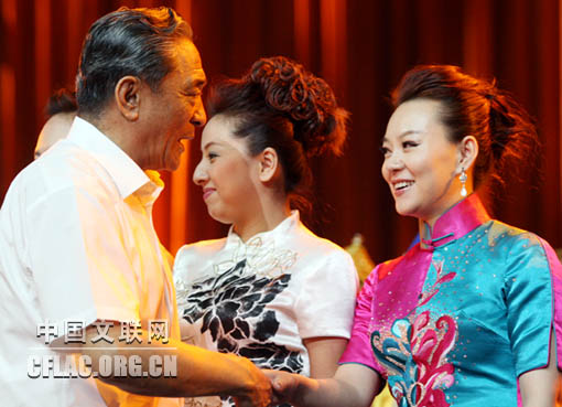 7月8日,“笑声与时代——庆祝中国曲艺家协会成立60周年专场晚会”在北京举行。图为演出结束后,原全国人大常委会副委员长顾秀莲和演员握手。中国文联网