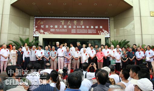 为纪念中国文联成立60周年、迎接新中国60华诞,由中国文学艺术界联合会、中国邮政集团公司主办,中国文联国内联络部、中国邮政文史中心承办,中国邮政邮票博物馆、《集邮博览》杂志社协办的“百花芬芳——纪念中国文联成立60周年集邮展”