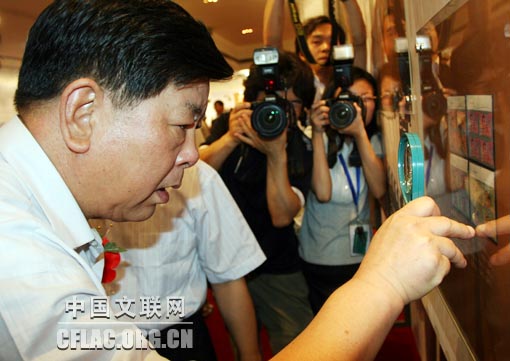 7月10日,由中国文学艺术界联合会、中国邮政集团公司主办,中国文联国内联络部、中国邮政文史中心承办,中国邮政邮票博物馆、《集邮博览》杂志社协办的“百花芬芳——纪念中国文联成立60周年集邮展”在中国邮政邮票博物馆与广大集邮爱好者见面。图为中国文联党组书记、副主席胡振民仔细欣赏邮票。中国文联网