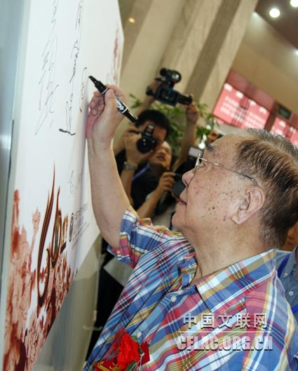 7月10日,由中国文学艺术界联合会、中国邮政集团公司主办,中国文联国内联络部、中国邮政文史中心承办,中国邮政邮票博物馆、《集邮博览》杂志社协办的“百花芬芳——纪念中国文联成立60周年集邮展”在中国邮政邮票博物馆与广大集邮爱好者见面。图为中国文联名誉主席周巍峙在展览纪念封上签名。中国文联网
