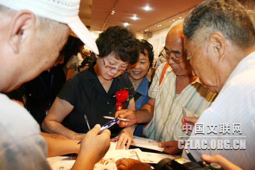 7月10日,由中国文学艺术界联合会、中国邮政集团公司主办,中国文联国内联络部、中国邮政文史中心承办,中国邮政邮票博物馆、《集邮博览》杂志社协办的“百花芬芳——纪念中国文联成立60周年集邮展”在中国邮政邮票博物馆与广大集邮爱好者见面。图为中国文联副主席李维康为邮迷签名。中国文联网