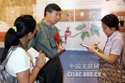 7月10日,由中国文学艺术界联合会、中国邮政集团公司主办,中国文联国内联络部、中国邮政文史中心承办,中国邮政邮票博物馆、《集邮博览》杂志社协办的“百花芬芳——纪念中国文联成立60周年集邮展”在中国邮政邮票博物馆与广大集邮爱好者见面。图为中国美术家协会分党组书记、副主席吴长江在自己的邮票设计原图前接受记者采访。中国文联网