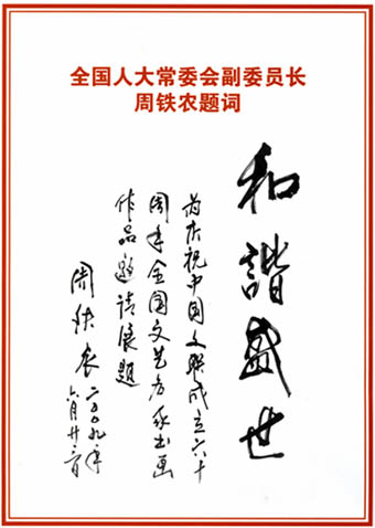 7月11日,“庆祝新中国成立60周年暨中国文联成立60周年全国文艺名家书画作品邀请展启动仪式”在北京全国政协礼堂举行。图为全国人大常委会副委员长周铁农题词。