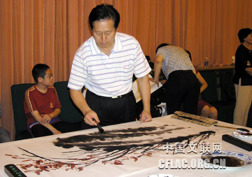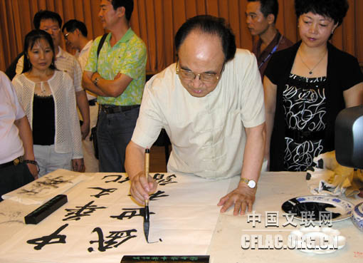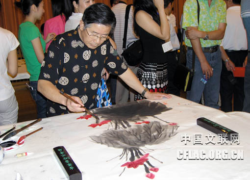7月11日,“庆祝新中国成立60周年暨中国文联成立60周年全国文艺名家书画作品邀请展启动仪式”在北京全国政协礼堂举行。图为书画家现场创作。中国文联网