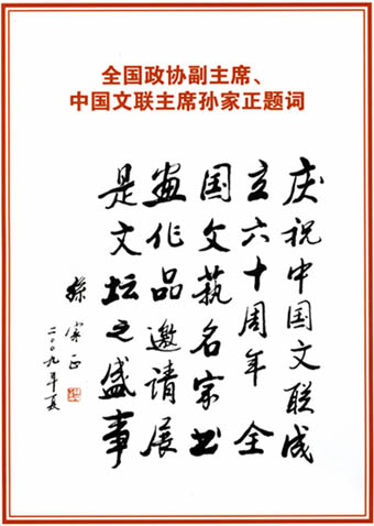 7月11日,“庆祝新中国成立60周年暨中国文联成立60周年全国文艺名家书画作品邀请展启动仪式”在北京全国政协礼堂举行。图为全国政协副主席、中国文联主席孙家正题词。