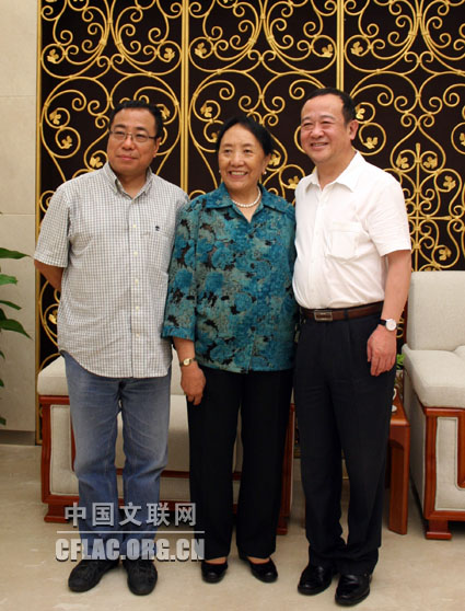 7月15日,中国文联副主席才旦卓玛,中国电影家协会分党组书记、副主席康健民,中国电影家协会副主席尹力,著名喜剧明星刘全和、刘全利做客人民网,与网友分享“我与文联”的故事。图为尹力、才旦卓玛、康健民(从左到右)在访谈前合影。中国文联网