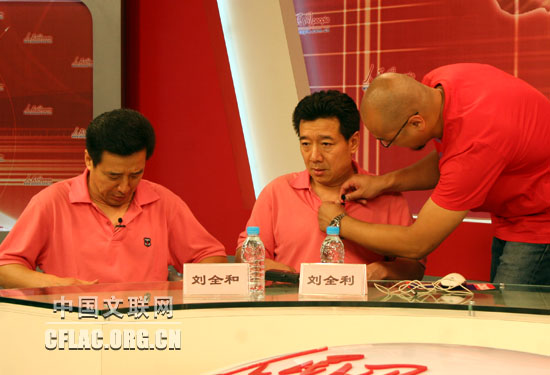 7月15日,中国文联副主席才旦卓玛,中国电影家协会分党组书记、副主席康健民,中国电影家协会副主席尹力,著名喜剧明星刘全和、刘全利做客人民网,与网友分享“我与文联”的故事。图为刘全和、刘全利在访谈前做准备。中国文联网