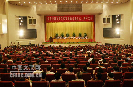 7月17日15时,纪念中国文联成立六十周年大会在北京人民大会堂隆重召开。全体代表起立,高唱国歌。中共中央政治局常委李长春向大会发来贺信。中宣部副部长翟卫华宣读贺信。