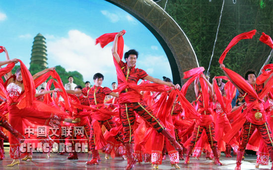 7月17日,《百花赋》纪念中国文联成立60周年文艺晚会在北京人民大会堂举行。图为耿莲凤等演唱《毛主席来到咱农庄》。中国文联网