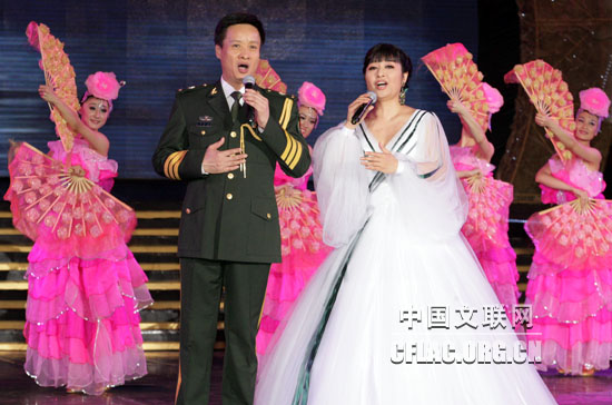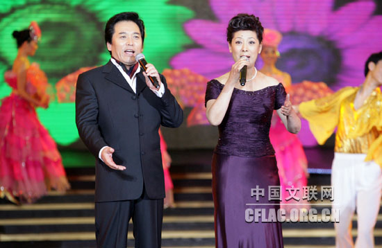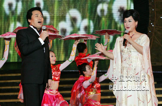 7月17日,《百花赋》纪念中国文联成立60周年文艺晚会在北京人民大会堂举行。图为阎维文、殷秀梅演唱。中国文联网