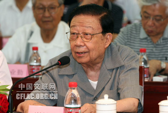 7月18日上午,纪念中国文学艺术界联合会成立六十周年座谈会在京召开。图为谢铁骊在座谈会上发言。中国文联网