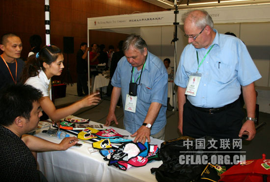 7月26日,在2009年北京世界魔术大会会场的魔术道具展销现场,两位外国魔术师对川剧变脸的道具产生了浓厚兴趣。中国文联网 余宁 摄