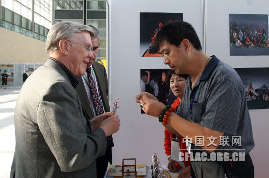 7月26日,在2009年北京世界魔术大会会场的中国民族民间手工艺制作展示现场,两位参加魔术大会的外国魔术师被精美的北京面塑工艺品吸引。中国文联网 余宁 摄