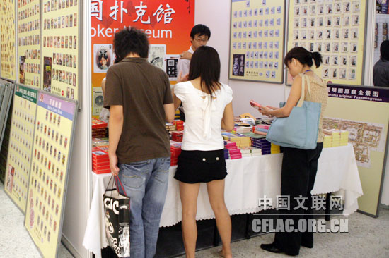 7月26日,2009年北京世界魔术大会正式开幕,在开幕式举行之前,魔术道具展销、魔术图片展、摄影展等周边项目率先亮相,其中魔术道具展销会将持续6天,贯穿整个魔术大会。图为道具展销会上中国扑克馆引人驻足观看。中国文联网 孟祥宁 摄