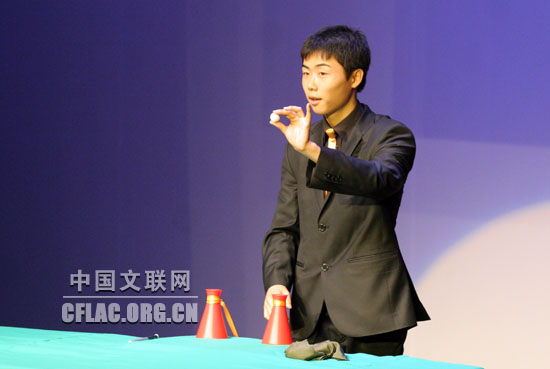7月27日,2009年北京世界魔术大会近台魔术比赛开始。图为参赛选手在表演。中国文联网 彭宽摄影报道