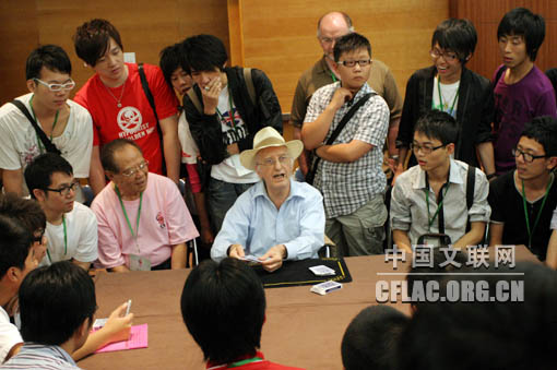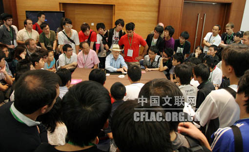 7月27日晚,2009年北京世界魔术大会当天的比赛和嘉宾舞台魔术表演结束后,魔术师胡安·达马利兹举办了小型的魔术沙龙,吸引了许多参会者。图为魔术沙龙现场。中国文联网 彭宽摄影报道