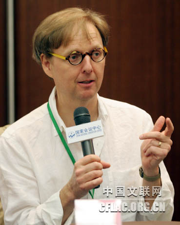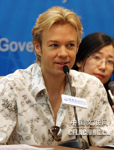 7月28日,2009年北京世界魔术大会举办期间第三次新闻发布会举行。图为著名魔术师皮特·马韦在发布会上回答记者提问。中国文联网