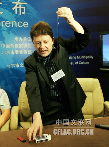 7月29日,2009年北京世界魔术大会举办期间第四次新闻发布会举行。图为著名魔术师米格在发布会现场表演魔术。中国文联网 余宁摄影报道