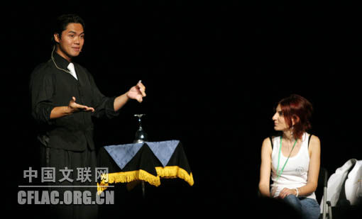7月28日晚,2009年北京世界魔术大会近台魔术嘉宾为参加大会的人员表演了精彩的节目。图为西班牙魔术师米格·普伽表演节目。中国文联网 彭宽摄影报道