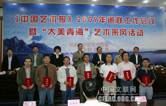 8月27日,《中国艺术报》2009年通联工作会议在充满活力的高原城市青海西宁开幕。图为出席开幕式领导向优秀记者站颁发荣誉证书。中国文联网