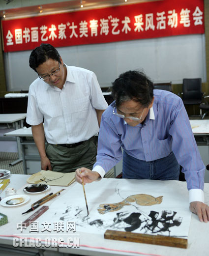 8月27日,《中国艺术报》2009年通联工作会议在充满活力的高原城市青海西宁开幕。图为全国书画艺术家“大美青海”艺术采风活动笔会现场。中国文联网