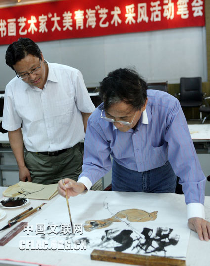8月27日,《中国艺术报》2009年通联工作会议在充满活力的高原城市青海西宁开幕。图为全国书画艺术家“大美青海”艺术采风活动笔会现场。中国文联网 孟祥宁 摄