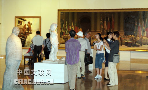 8月21日,由文化部主办,中国美术馆承办的“向祖国汇报——新中国美术60年”大型展览在中国美术馆举办。图为观众在有时代烙印的作品前驻足。中国文联网 段泽林摄影报道