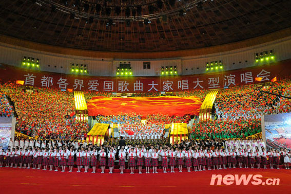 由中宣部、中央文明办等10部委和中共北京市委、市政府共同主办的首都各界“爱国歌曲大家唱”大型演唱会8月26日下午在北京工人体育馆举行,约1万名群众唱起《没有共产党就没有新中国》《爱我中华》《北京欢迎你》《今天是你的生日》等24首经典爱国歌曲。