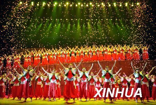 9月1日,演员在说唱剧《解放》的演出中。当晚,由中共山西省委宣传部、国家大剧院、山西省文化厅主办,山西戏剧职业学院与国家大剧院联合出品的大型山西说唱剧《解放》在国家大剧院迎来首演。《解放》集说书、舞蹈、民歌、戏曲于一体,为观众讲述了一段黄土高坡上凄美的爱情故事。作为中宣部、文化部“庆祝中华人民共和国成立60周年献礼演出”的重要剧目之一,该剧将在九月上旬演出七场。新华社记者 罗晓光 摄