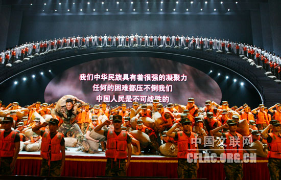 作为一部以中华民族169年探索、奋斗、发展史为线索的全景式史诗性艺术作品,《复兴之路》在两个半小时的演出中艺术而集中地展示了观众熟知的重大历史事件,鸦片战争、辛亥革命、中国共产党成立、抗日战争、解放战争、新中国成立、改革开放,及至近年来的香港澳门回归、海峡两岸直航、九八抗洪、“神五”上天等都以凝练而生动的艺术形式呈现在观众面前。以第一章《山河祭》为例。记者在现场看到,1840年圆明园的一场昆曲演出拉开了本章的序幕,华丽的场景、悠扬的曲声中,一群身着戏服的昆曲演员身段婀娜地表演着《惊梦》,清朝宫廷的太监、宫女不断穿场而过。忽然,一声炮响,舞台上的大屏幕中,一面巨大的镜子霎时破裂,演员、宫女、太监乱作一团、四散奔走。音乐即转为咚咚的急促与紧张,大屏幕上,西方列强的炮火硝烟不断闪现,《南京条约》等一系列不平等条约的字幕也铺满了整个舞台。一段悲怆的诵赋《山河祭》响起,“盘古开天,三皇拓土……列强入室、赤县刀俎……”,催人泪下。在稚气的《辛亥童谣》声中,一群舞蹈演员以当时剪辫子的行动,形象地表现了革命的悲壮,经过不断挣扎与努力,最终演员们仰天高呼出了“天下为公”。《曙色》的歌声响起了,600多位演员密密麻麻一个紧挨着一个,组成了一道立体人墙,他们呐喊、抗争,象征着国人不屈的精神,也寓意只有团结起来才能获得自由。从1840年到1921年,80多年的历史,就是通过《惊梦》《山河祭》《辛亥童谣》《曙色》这4个节目生动地表现了出来,气势磅礴,感人至深。