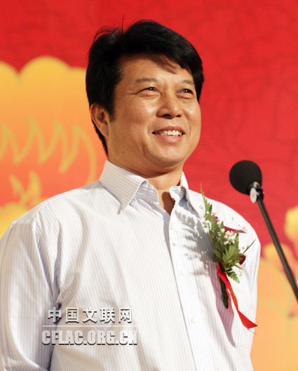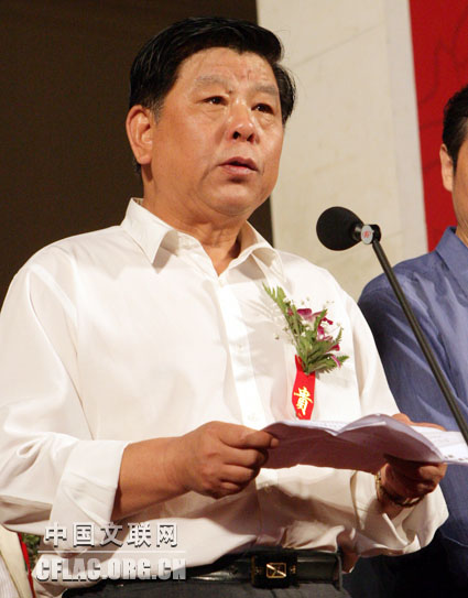 由中国文联、中国美协、中国书协、中国摄协、中国民协主办,中国文学艺术基金会、中国艺术报社协办的“向祖国汇报”——庆祝新中国成立60周年暨纪念中国文联成立60周年美术书法摄影民间艺术精品展9月24日在京开幕。图为中国文联党组副书记、副主席覃志刚主持开幕式。中国文联网 孟祥宁 摄