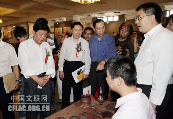 由中国文联、中国美协、中国书协、中国摄协、中国民协主办,中国文学艺术基金会、中国艺术报社协办的“向祖国汇报”——庆祝新中国成立60周年暨纪念中国文联成立60周年美术书法摄影民间艺术精品展9月24日在京开幕。图为中国文联党组书记、副主席胡振民,中国文联党组成员、副主席杨志今,中国文联党组成员、书记处书记廖奔等观看现场制作民间工艺品。中国文联网 孟祥宁 摄