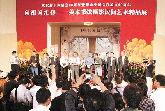 由中国文联、中国美协、中国书协、中国摄协、中国民协主办,中国文学艺术基金会、中国艺术报社协办的“向祖国汇报”——庆祝新中国成立60周年暨纪念中国文联成立60周年美术书法摄影民间艺术精品展9月24日在京开幕。