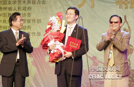 9月23日,由中国文联、贵州省人民政府主办,中国舞协、贵州省委宣传部、贵阳市人民政府主承办的第七届中国舞蹈“荷花奖”民族民间舞大赛在贵阳拉开帷幕。图为中国文联荣誉委员、中国舞协名誉主席贾作光和贵阳市委常委、宣传部长蒋星恒为本届比赛的冠名协办单位贵州宏立城集团颁发荣誉证书和纪念杯。中国文联网 彭宽 摄