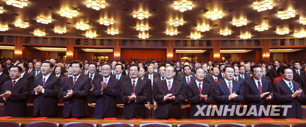 19时40分许,在欢快的乐曲声中,胡锦涛、江泽民等领导同志步入大礼堂,全场响起热烈的掌声。