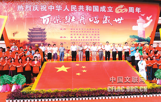 日前,由湖北省文联和湖北省剧协主办的“热烈庆祝新中国成立60周年——百朵牡丹唱盛世”文艺演出吸引了武汉4000多名群众一起观看。肖慧芳、朱世慧、杨俊、张辉等艺术家纷纷登台献艺,整场演出涵盖了京剧、汉剧、楚剧、黄梅戏等剧种,既有新中国成立初期创作的红色经典歌剧《洪湖赤卫队》,也有改革开放后的新编楚剧《狱卒平冤》、京剧《法门众生相》、汉剧《王昭君》等,更有近年声名鹊起的“汉派”小品,以及列入我国非物质文化遗产的阳新采茶戏等小剧种作品。由湖北省曲协主办的曲艺专场晚会、湖北省书协主办的“光辉岁月——书法作品展览”也为江城人民献上了一台文艺盛宴。