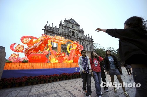 澳门地标性建筑大三巴牌坊前依旧游人如织,而牌坊左侧新设的一座五彩缤纷的舞狮彩台,为在此留影的旅客又增添了一幅靓丽的背景。造型活泼的双狮周围簇拥着盛世莲花和喜庆鞭炮,两只彩狮还分别吐出两幅字:“共创辉煌十周年”、“携手发展谱新篇”。双狮中间,硕大的阿拉伯数字“10”上的两排大字“热烈庆祝澳门特别行政区成立十周年”格外引人注目。