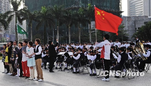 2009年11月8日,澳门回归十周年主题歌曲MTV外景拍摄在澳门回归广场进行,来自全区近千名中小学师生参加了活动。 中新社发 滨海之光 摄