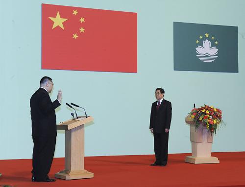 12月20日,中共中央总书记、国家主席、中央军委主席胡锦涛出席庆祝澳门回归祖国10周年大会暨澳门特别行政区第三届政府就职典礼。这是由国家主席胡锦涛监誓,在崔世安带领下,澳门特别行政区第三届政府主要官员及检察长宣誓就职。新华社记者 樊如钧 摄