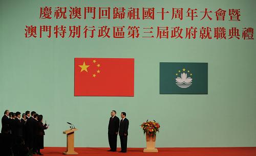 新华网澳门12月20日电(记者 孙承斌 张勇 吕诺)庆祝澳门回归祖国10周年大会暨澳门特别行政区第三届政府就职典礼20日上午在澳门东亚运动会体育馆隆重举行,中共中央总书记、国家主席、中央军委主席胡锦涛出席并发表重要讲话。他指出,“一国两制”在澳门的成功实践,为澳门发展谱写出新的辉煌篇章,为国家发展增添了夺目光彩。我们坚信,澳门的明天与伟大祖国一样,一定会更加美好;澳门同胞的未来生活与全国各族人民一样,一定会更加幸福。
