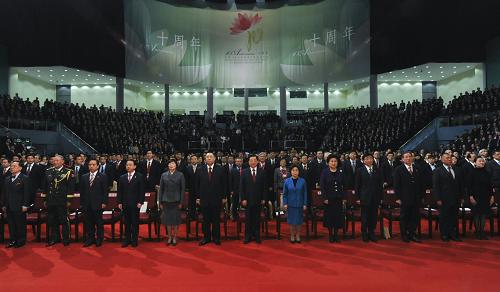 今天是澳门回归祖国10周年的喜庆日子,澳门东亚运动会体育馆洋溢着庄严而热烈的气氛。会场里摆放着盛开的鲜花,主席台上方悬挂着鲜艳的中华人民共和国国旗和澳门特别行政区区旗。当胡锦涛和夫人刘永清在澳门特别行政区第三任行政长官崔世安和夫人霍慧芬陪同下步入会场时,全场起立鼓掌。