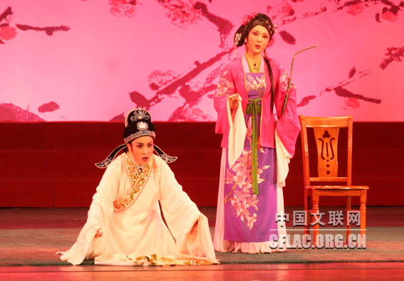 12月28日晚,中国剧协梅花奖艺术团“鹰潭行”慰问演出在鹰潭影剧院举行。图为谢群英、陈雪萍表演越剧《新狮吼记·跪池》。高扬 摄