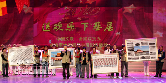 12月31日下午,中国文联等组织艺术家到海军大连舰艇学院开展2010年“送欢乐 下基层”慰问活动。图为中国摄影家协会向海军大连舰艇学院赠送摄影作品。