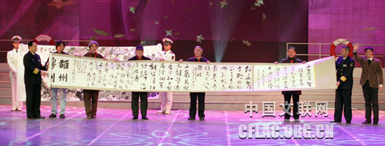 12月31日下午,中国文联等组织艺术家到海军大连舰艇学院开展2010年“送欢乐 下基层”慰问活动。图为中国书法家协会向海军大连舰艇学院赠送书法作品。