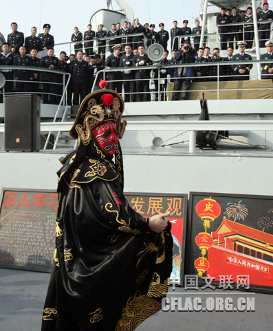 1月1日,中国文联等单位组织艺术家“送欢乐、下基层”,深入旅顺军港为官兵们演出。图为李彦培表演魔术《变脸》。中国文联网 孟祥宁 摄